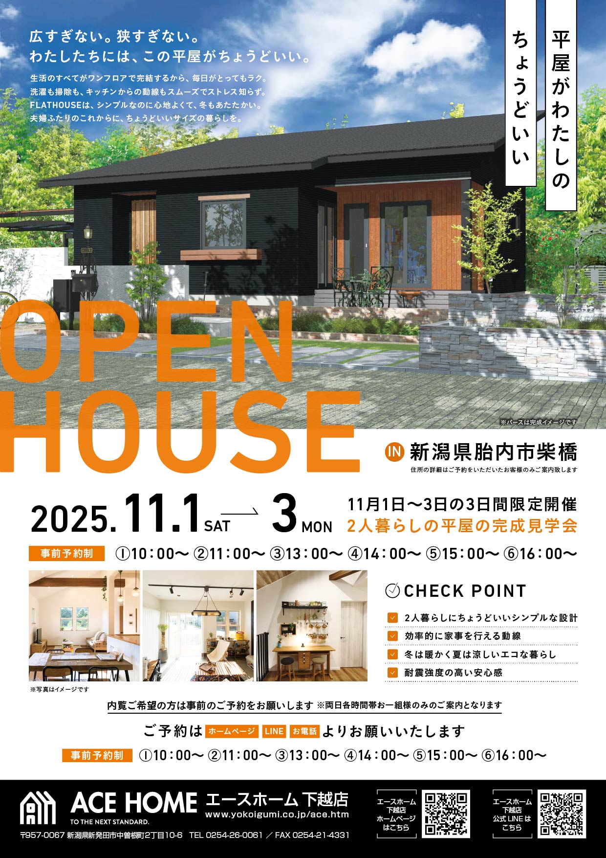 11月1日(土)~3日(月)、エースホーム下越店では新潟県胎内市柴橋におきまして完成見学会を開催いたします。